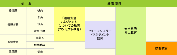 | コンセプト教育 | 経営層から監督者層(現業長)を対象に、運輸安全マネジメントの趣旨について学ぶ |