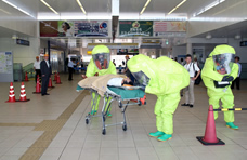2011年6月に、海老名駅コンコース・自由通路で「鉄道テロ対応訓練」を警察・消防と連携して実施しました。今回は、「液体の入ったビンから異臭が発生し、お客さまが倒れていた」との想定で、「鉄道テロ対応マニュアル」の内容を踏まえ、被害拡大防止のための立入禁止区域の設定や安全な場所への避難誘導などを行いました。