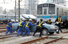 50年近くにわたり毎年実施している「異常時総合訓練」を、2011年10月に、海老名電車基地で警察・消防と合同で実施しました。今回の訓練では、「電車が踏切で乗用車と接触し脱線、乗用車が炎上」という事故を想定し、併発事故の防止や初期消火活動、お客さまの避難誘導、負傷者の対応など多岐にわたり訓練を行いました。