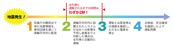 地震・気象情報監視システムのほか、地震発生時の被害軽減のため、2006年より「早期地震警報システム」を導入しています。これは一定規模以上の地震が発生した際、気象庁から配信される「緊急地震速報」を利用し、主要動の到達予想時刻・最大予想震度など当社線への影響を瞬時に判定。被害が予測される場合には、全列車に自動的に通報することにより、運転士が手動で電車を緊急停止させるものです。