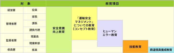 安全のスキルアップとヒューマンエラー防止のために、経営層から現業係員まで職位に合わせた適切な安全教育プログラムを組んでいます。また、安全意識を高め、維持・継承していくには、過去の鉄道事故や輸送障害を憂い、その悲惨さや心の痛みを忘れることなく伝えていくことも重要であるとの認識から、鉄道人としての心の形成も踏まえた安全教育体系の整備を進めています。