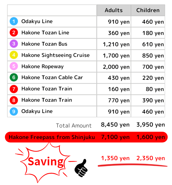 For example, if you take a day trip from Shinjuku to Hakone-Yumoto, cruise on Lake Ashi with the Hakone Sightseeing Cruise, ride the Hakone Ropeway to Owakudani, stroll through Gora Park, and visit the Hakone Open-Air Museum before returning to Shinjuku, you’ll save ¥1,350 compared to regular tickets or IC cards.