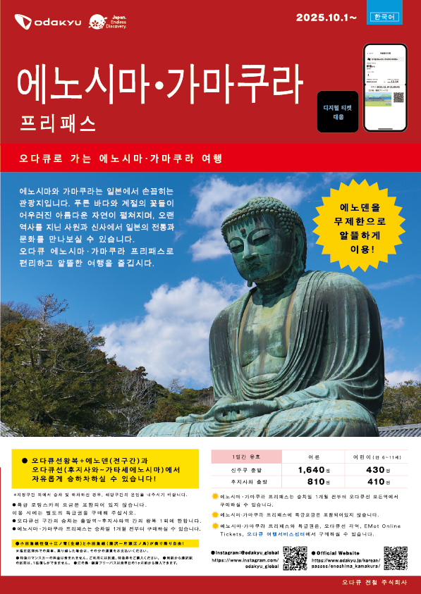 •에노시마 가마쿠라 프리패스는 후지사와~가타세 에노시마 구간의 무제한 이용과 출발역~후지사와역 구간의 오다큐선 왕복 1회 이용이 포함되어 있습니다.