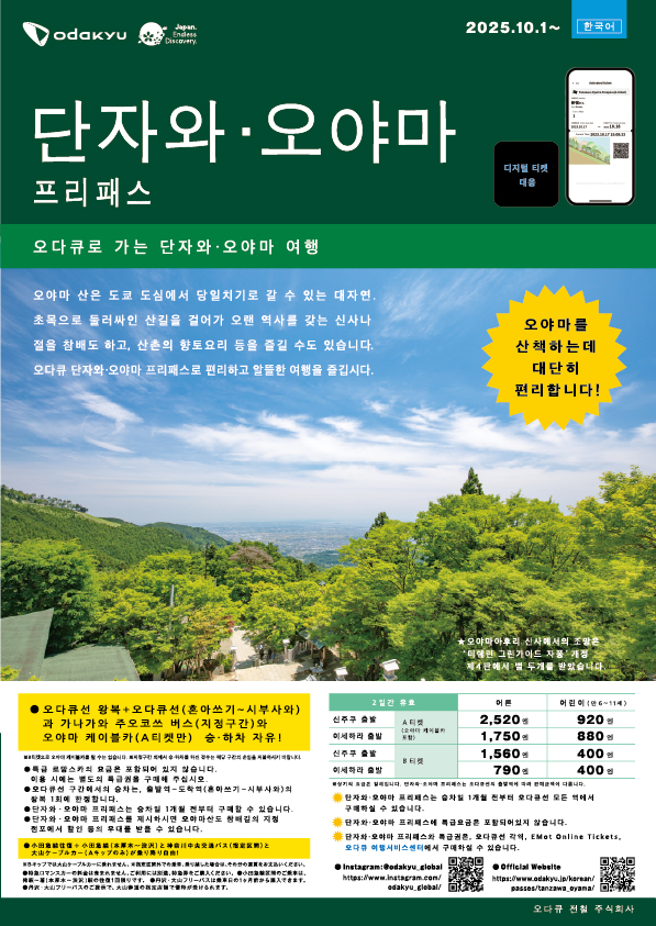 •단자와/오야마 프리패스는 혼아쓰기~시부사와 구간의 무제한 이용과 출발역~혼아쓰기역 또는 시부사와 구간의 오다큐선 왕복 1회 이용이 포함되어 있습니다.