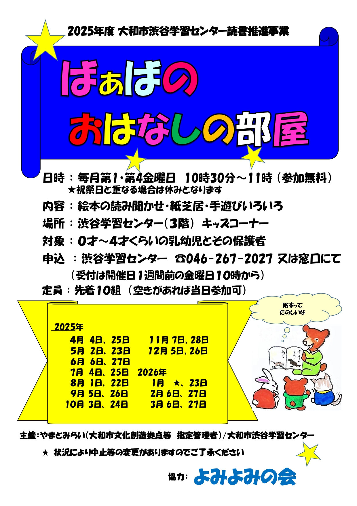 | 開催場所 | 大和市渋谷学習センター 3階キッズコーナー(※2025年12月5日は304講習室) |