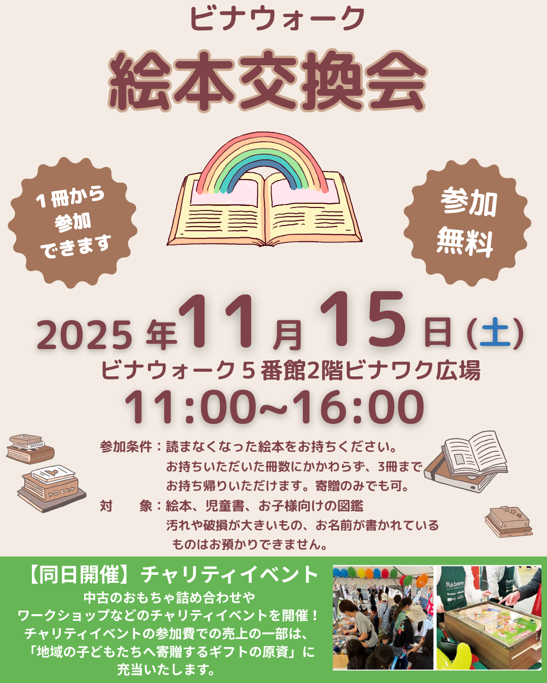 2025年11月15日(土)、ビナウォーク5番館2階 ビナワク広場(AMERICAN HOLIC横)にて、読まなくなった絵本・児童書を次の子どもたちへつなぐ『絵本交換会』を開催します🌈
