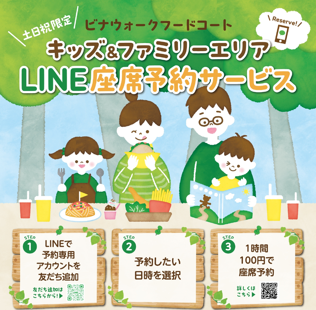 ビナウォーク3番館1階のフードコート「キッズ&ファミリーエリア」では、土日祝の混雑時でも安心してご利用いただけるよう、LINE座席予約サービスを導入しています。
