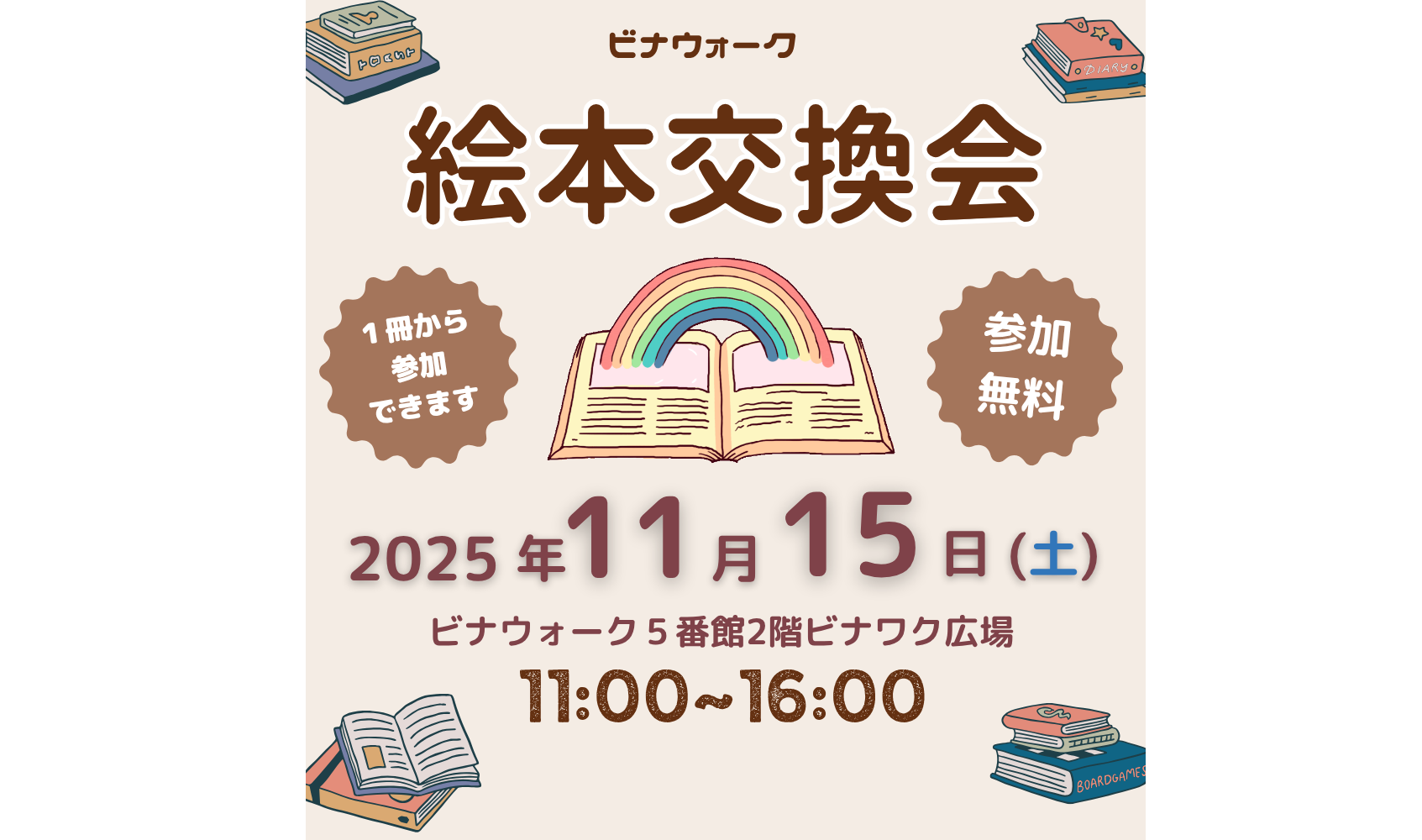 2025年11月15日(土)、ビナウォーク5番館2階 ビナワク広場(AMERICAN HOLIC横)にて、読まなくなった絵本・児童書を次の子どもたちへつなぐ『絵本交換会』を開催します🌈