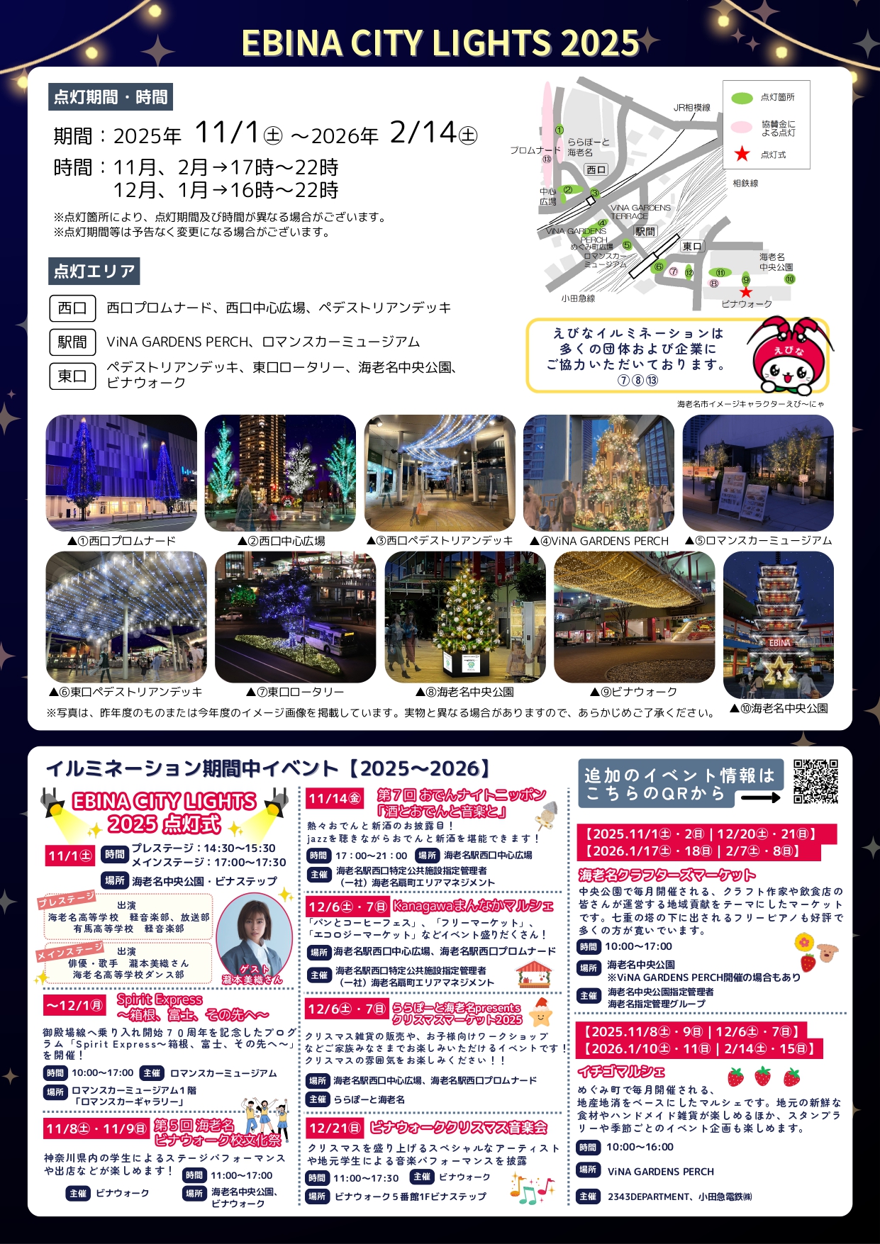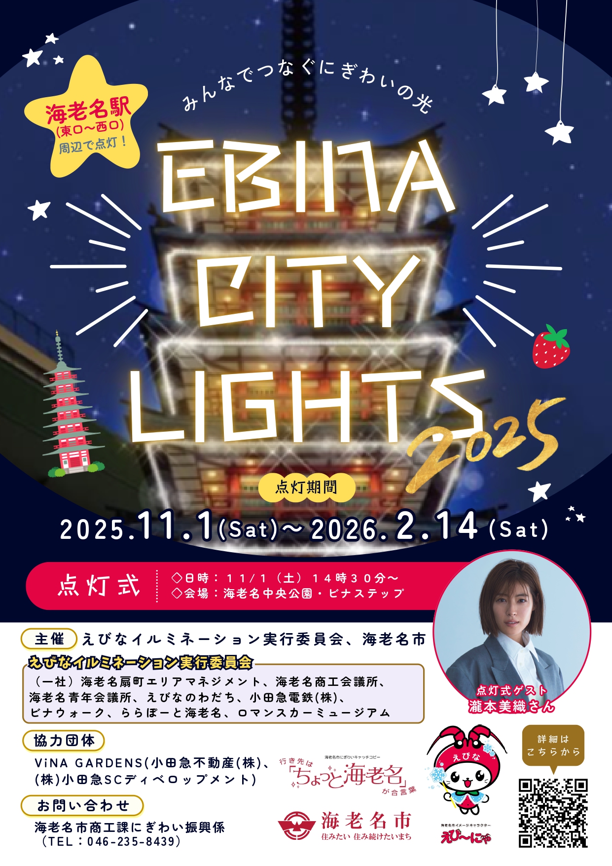 えびなイルミネーション実行委員会、海老名市 実行委員 (一社)海老名扇町エリアマネジメント、海老名商工会議所、海老名青年会議所、えびなのわだち、小田急電鉄株式会社、ビナウォーク、ららぽーと海老名、ロマンスカーミュージアム 協力 :ViNA GARDENS(小田急不動産株式会社、株式会社小田急SCディベロップメント) |
