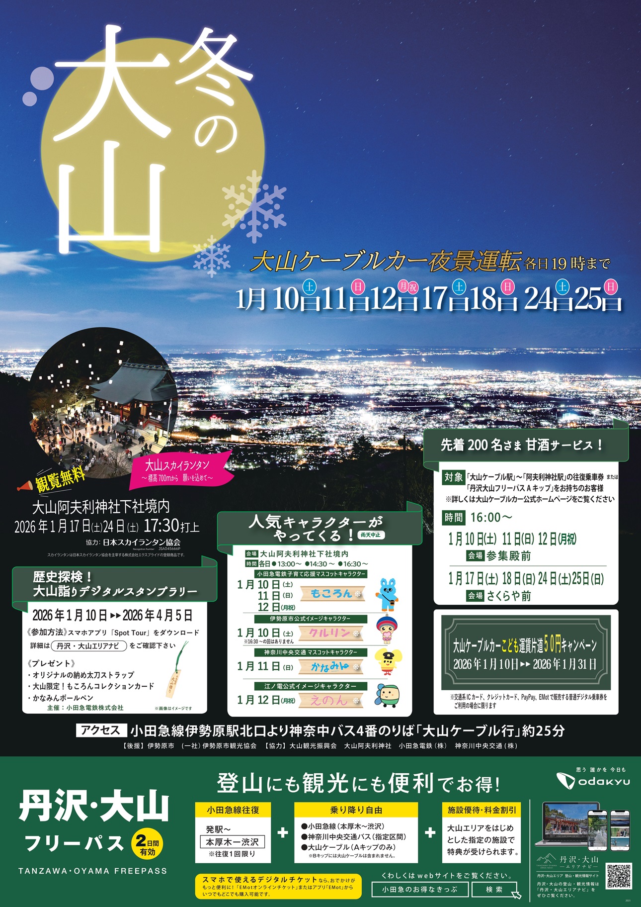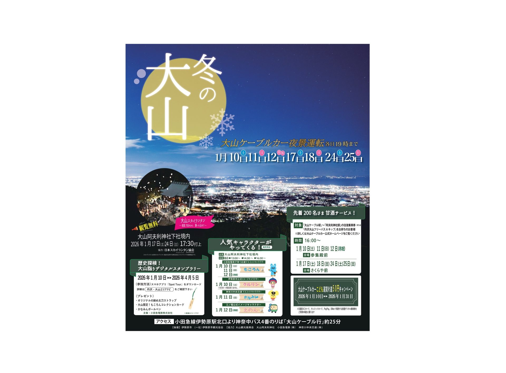大山ケーブルカーの「冬の夜景運転」の実施に合わせて、1月10日(土)~12日(月・祝)、17日(土)、18日(日)、24日(土)、25日(日)に、大山ケーブルカーに乗車された方に、大山ケーブルカー「阿夫利神社駅」で「大山限定!もころんポストカード」をプレゼントします🎁✨
