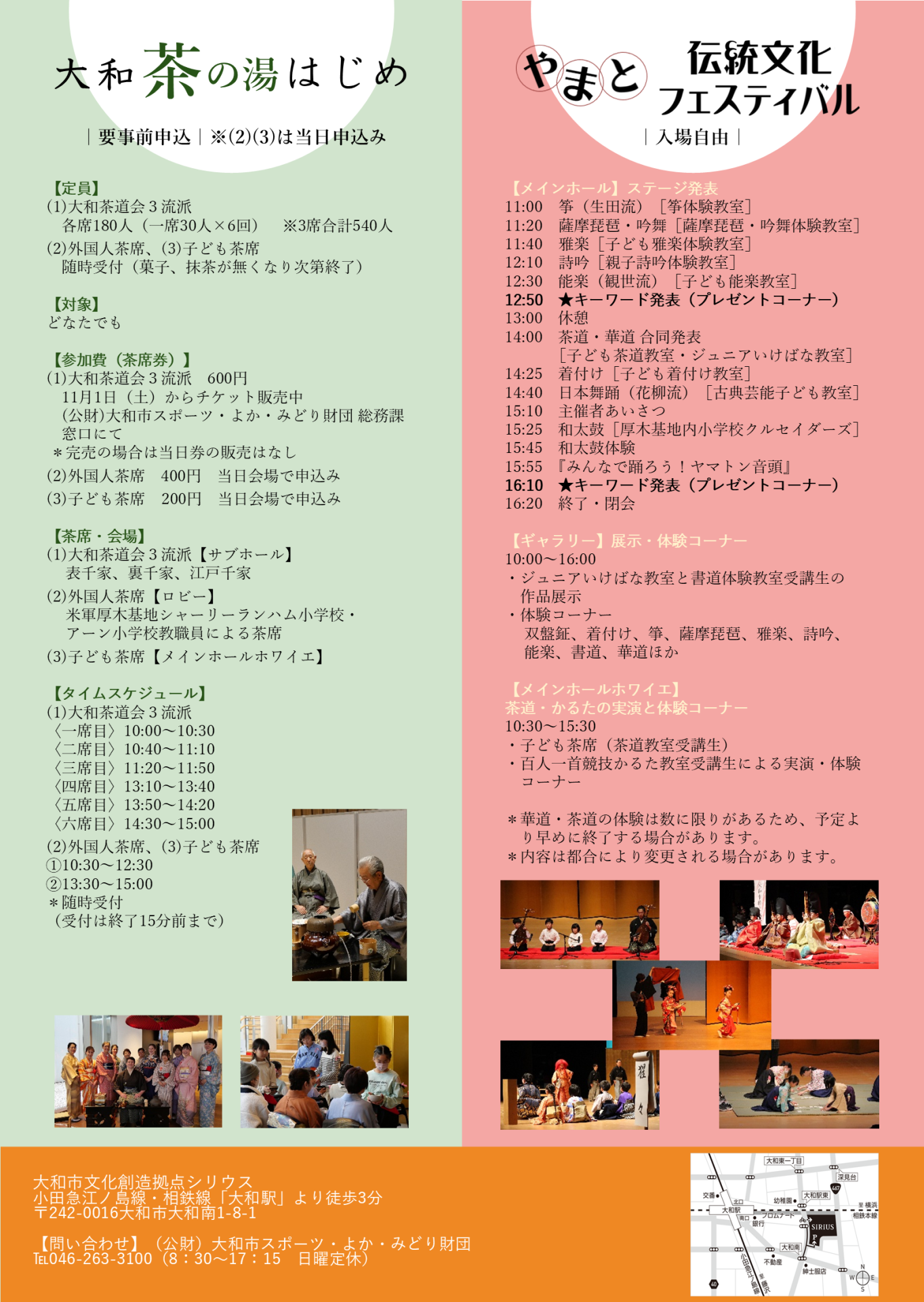 「やまと伝統文化フェスティバル」無料 「大和茶の湯はじめ」⑴大和茶道会茶席(表千家・裏千家・江戸千家)各600円、⑵外国人茶席400円、⑶子ども茶席200円 |