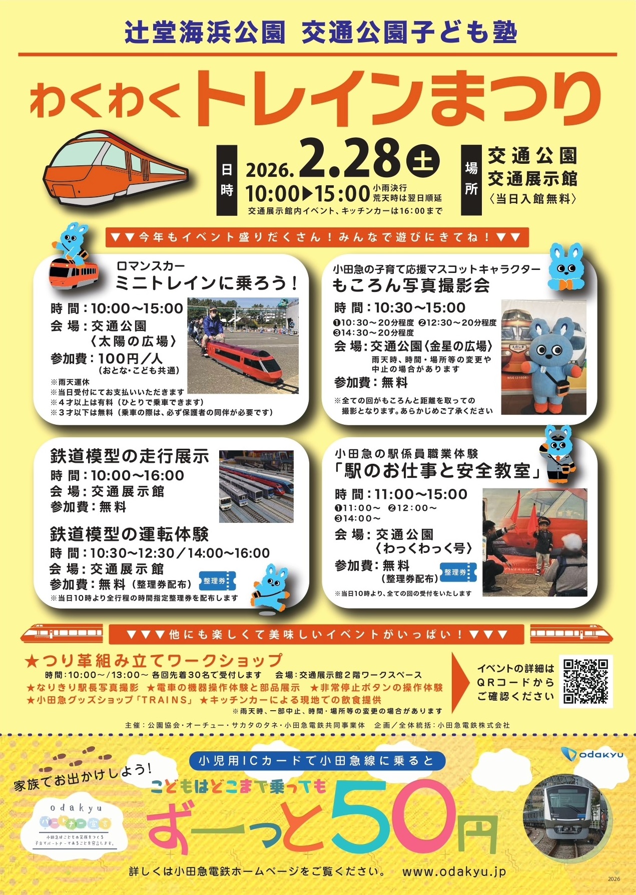 2026年2月28日(土)、神奈川県立辻堂海浜公園の交通公園および交通展示館にて「わくわくトレインまつり」を開催いたします🚃✨