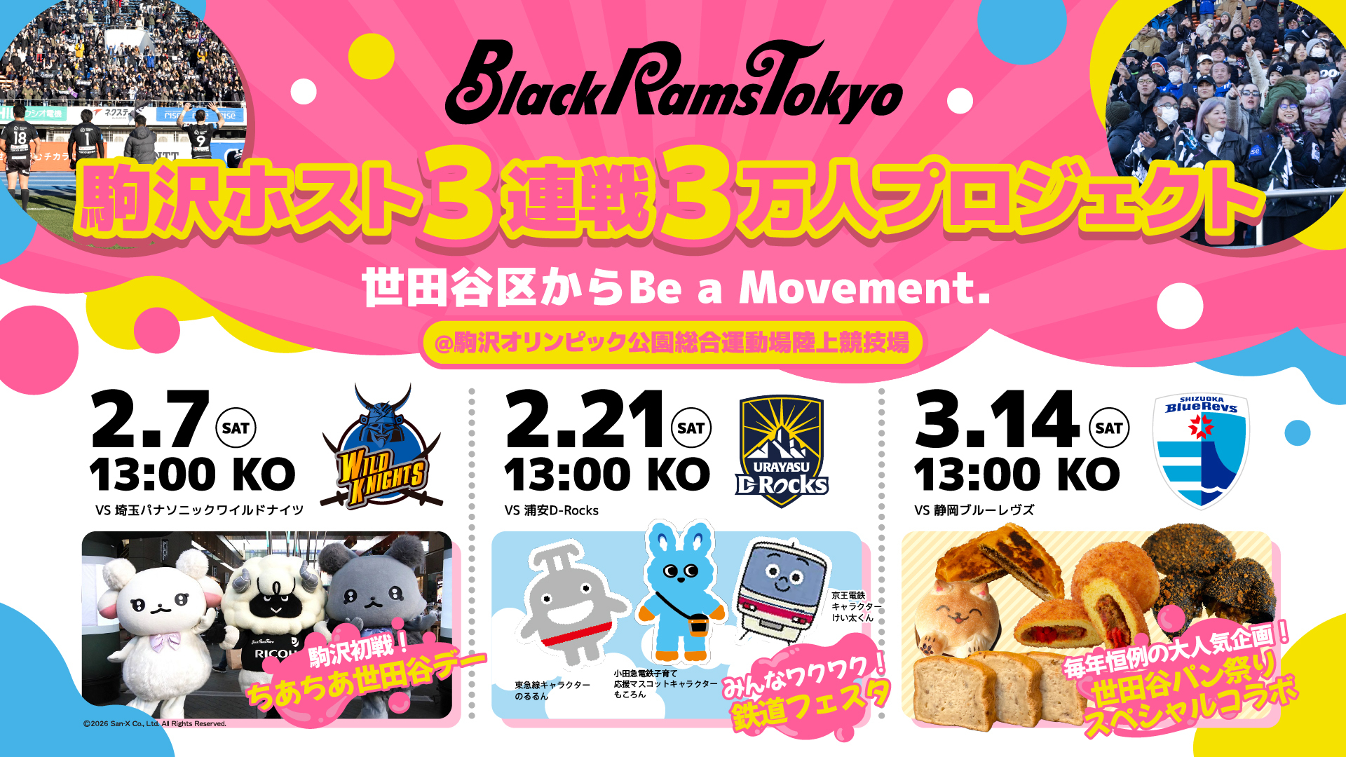 ブラックラムズ東京 マスコットキャラクター【ラムまる】、東急線キャラクター【のるるん】、京王線キャラクター【けい太くん】も、もころんと一緒に登場しますので、みなさんぜひお子さまと一緒に遊びにきてくださいね😊♪