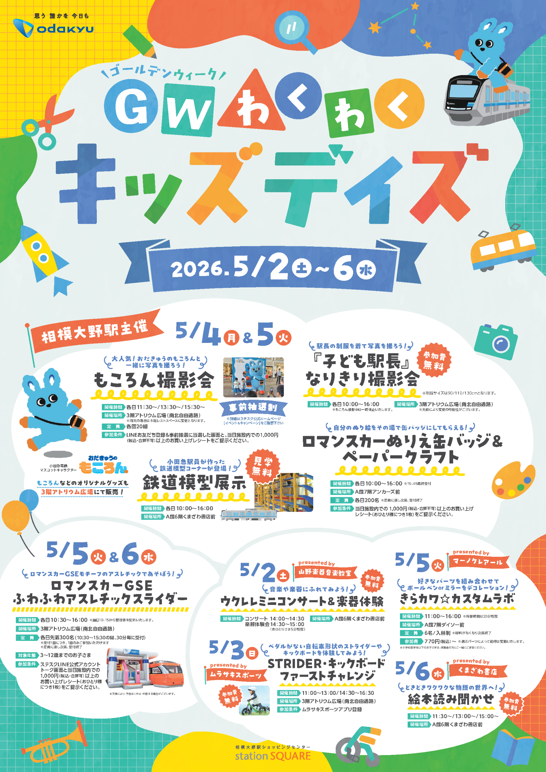 相模大野ステーションスクエアでは、GWの5月2日(土)~6日(水・祝)の期間、親子で楽しめるイベントが盛り沢山の「GWわくわくキッズデイズ」イベントを開催します🎉