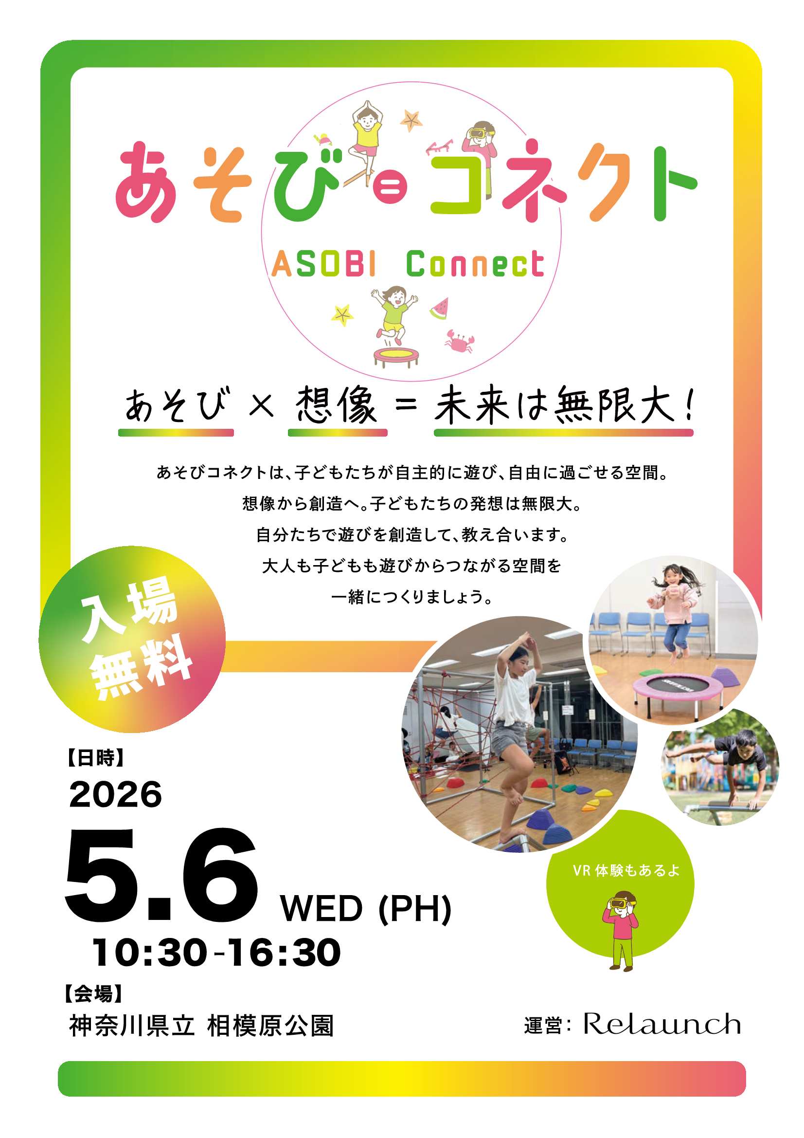 子どもたちの“あそび”が無限に広がる体験イベント「あそび=コネクト」が、2026年5月6日(水・祝)に神奈川県立相模原公園で開催されます🌈