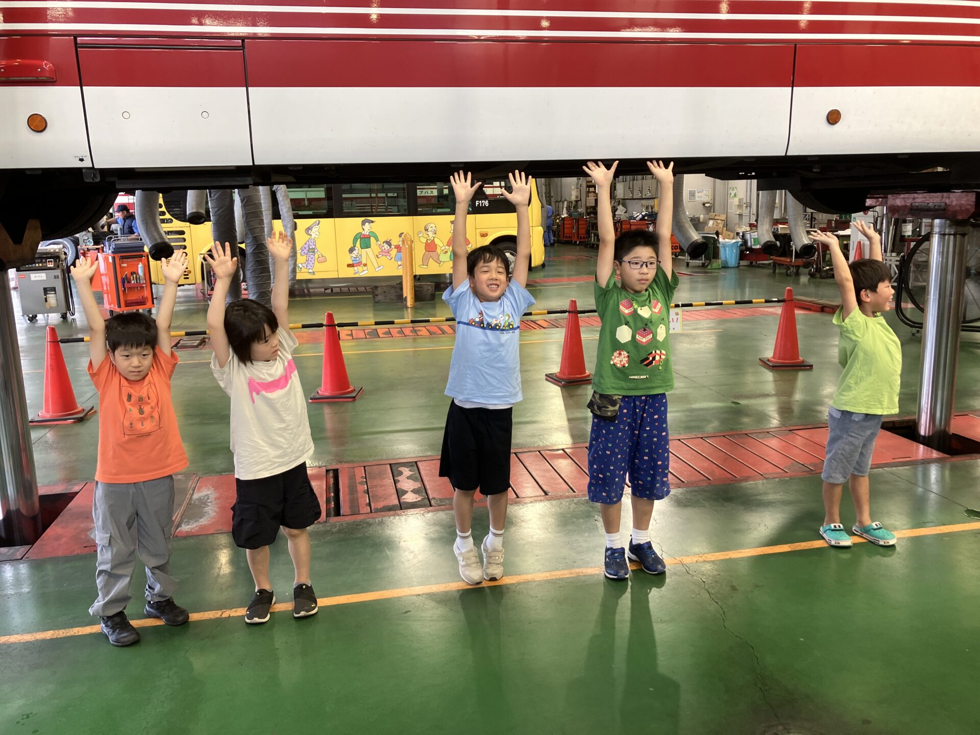 運転士の体験の後は、工場へ移動しました。普段は見ることができないバスの下部やエンジンルームを確認し、車両点検がどのように行われているのかを学びました。目の前でバスが吊り上げられる光景は、迫力満点でした。
