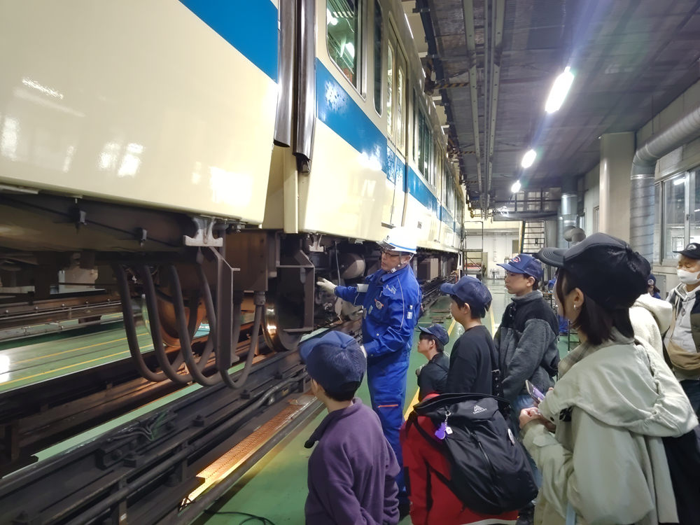 集合写真撮影後は、整備士の1日の仕事内容を動画で確認し、実際に整備士より説明を受けながら床下機器の見学をしました。普段触ることのできないブレーキシューを持ったりするなど貴重な体験をしていただきました。8000形車内では、運転席での記念撮影、アナウンス体験や扉操作体験をしていただき、アナウンス体験では台本がないのにすらすらと停車駅や行先のご案内をする姿に、スタッフ一同驚きもありましたが、小田急愛を感じ大変嬉しかったです。