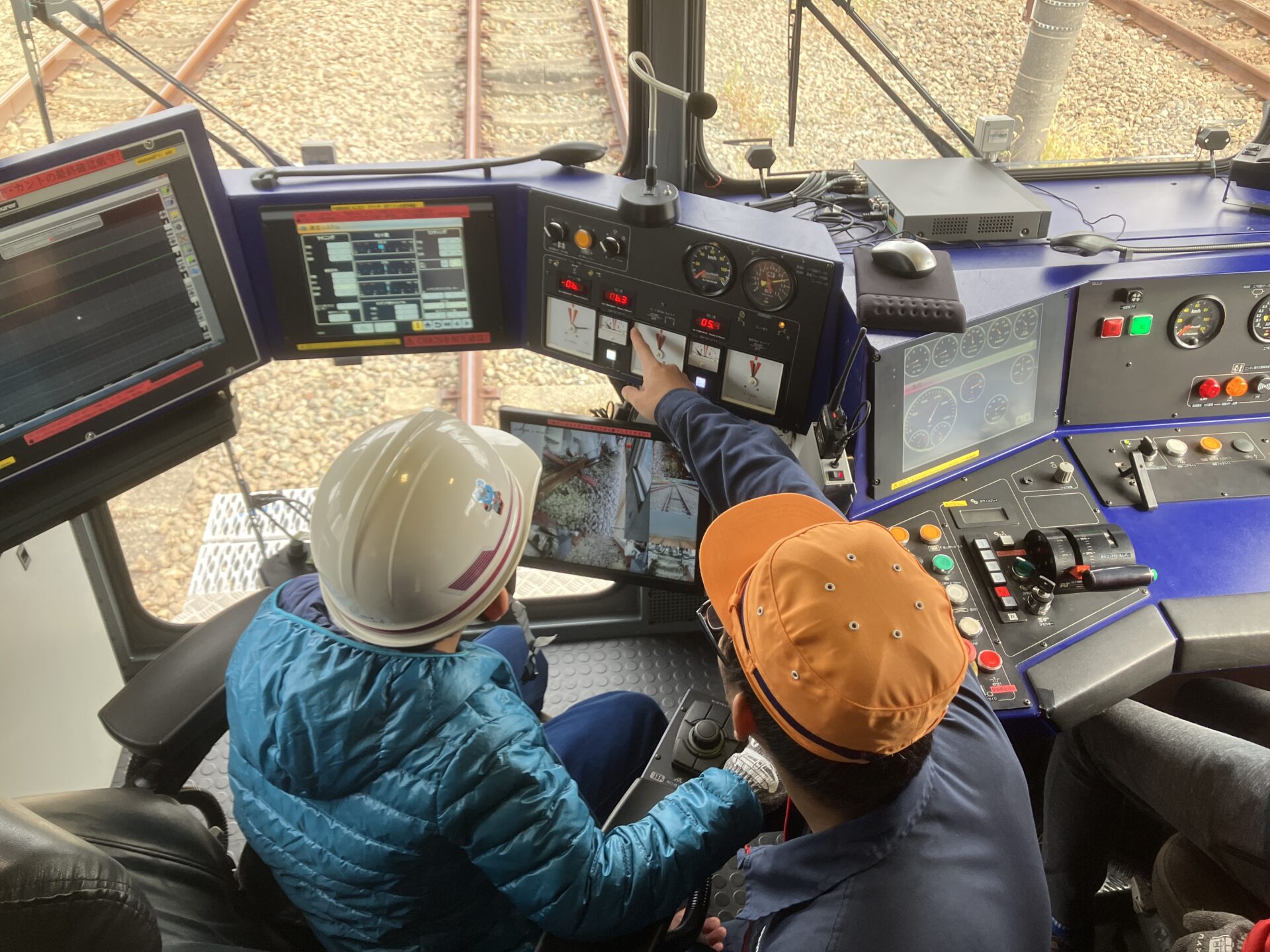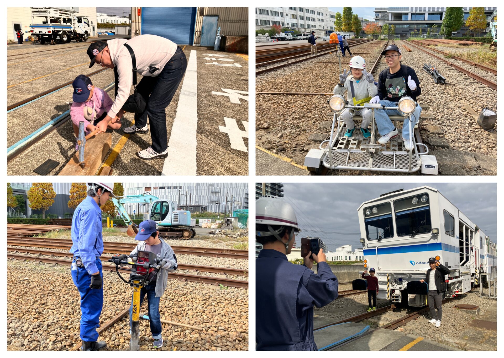 レール締結や道床バラスト(線路に敷き詰められた砕石)の搗き固め体験、タワー車(軌陸車)の走行体験、直流高速度遮断器(高電圧の電気を入り切りできる専用のスイッチ)の操作体験、踏切保安装置(踏切非常ボタン)の操作体験、転てつ機(ポイント)の手回し体験、マルチプルタイタンパーの操作体験および実演などを行いました。