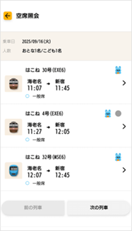 ※「ロマンスカーの子育て応援車」の対象列車にはもころんのアイコンが表示されます。