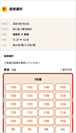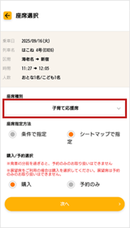 座席の種類を選択する際、子育て応援席をご選択ください。