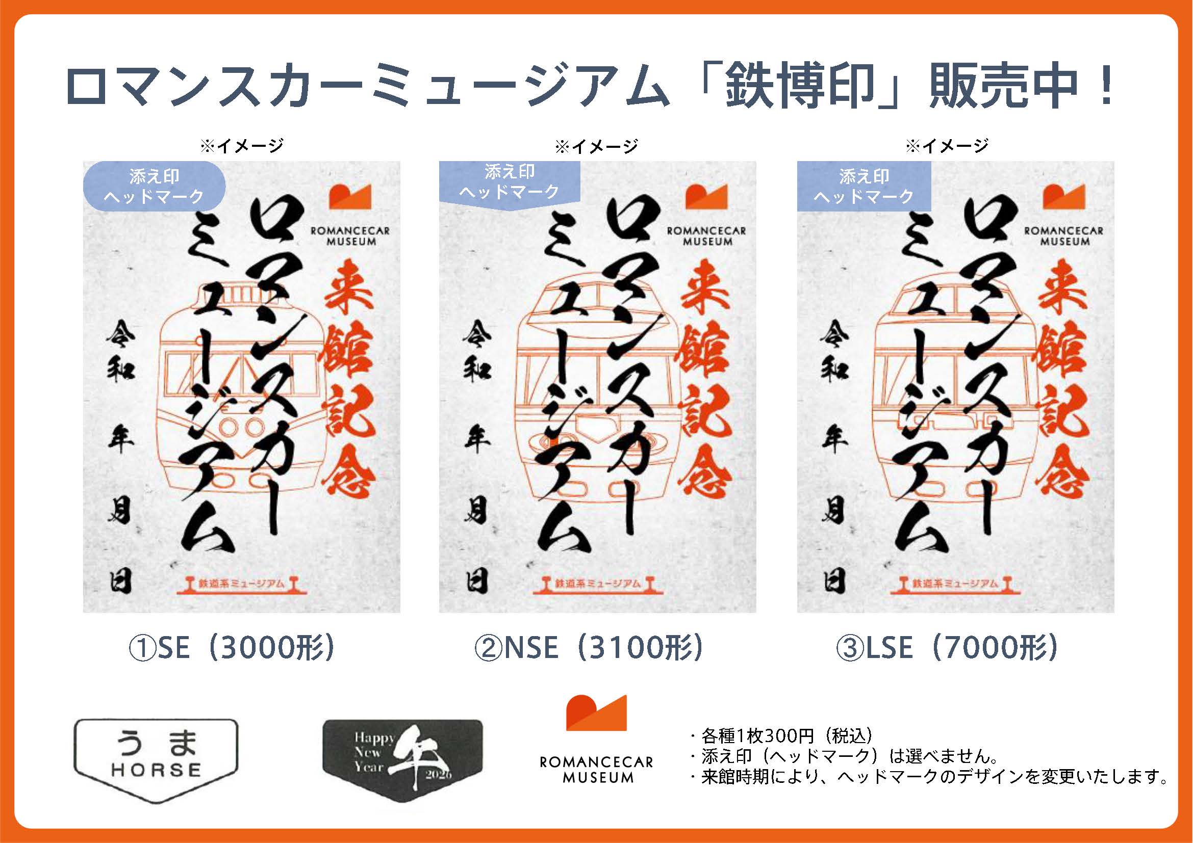 1階ロマンスカーギャラリーに展示しているロマンスカーのヘッドマーク・愛称幕のお正月仕様にあわせて、「うま」と「午」のオリジナル添え印に変更いたします。期間限定となりますので、この機会にぜひお買い求めください♪