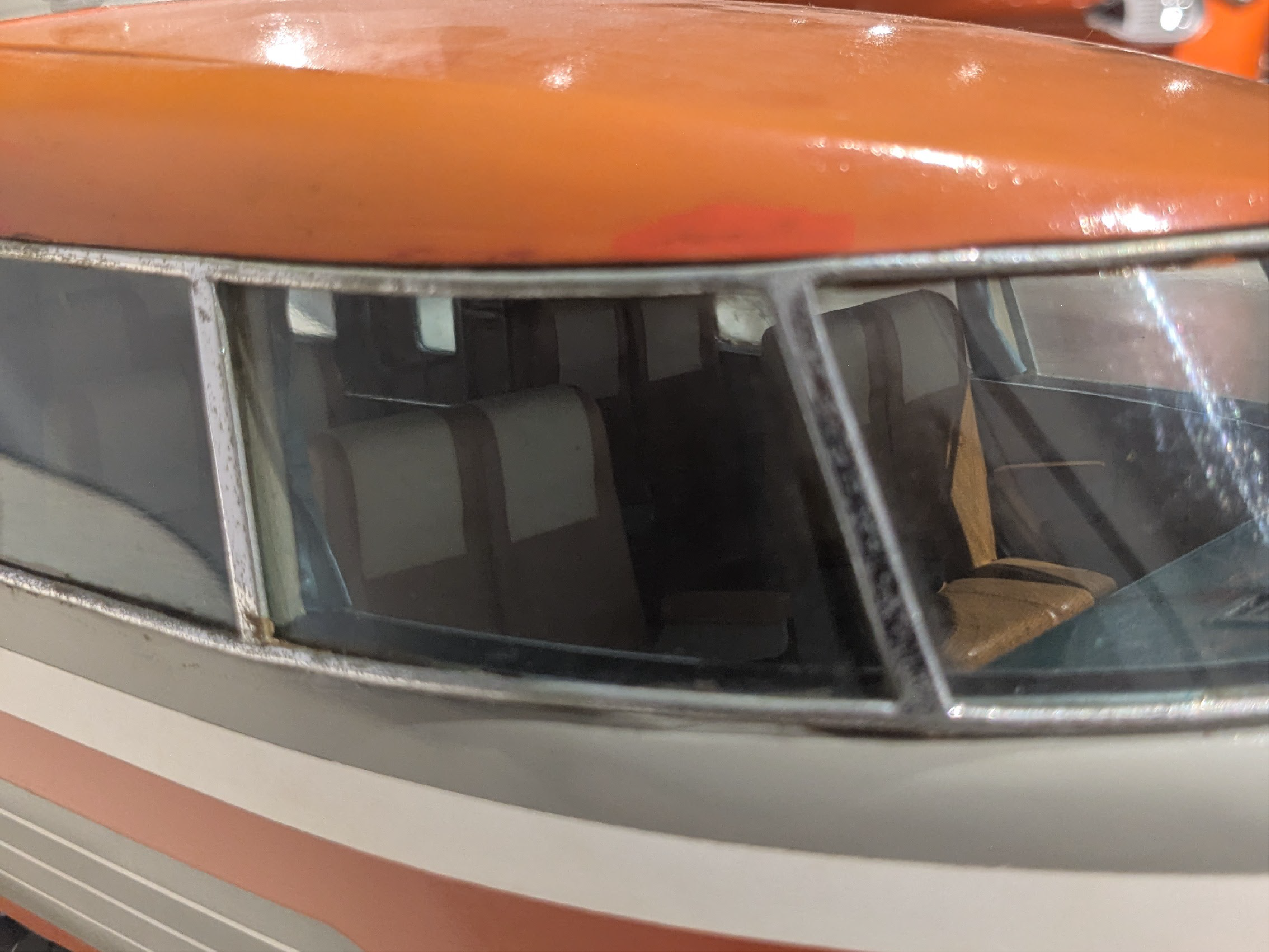 NSEは就役後に改装や機器更新が行われましたが、本模型は1963(昭和38)年の就役当初の姿を忠実に再現しています。座席の表地が金茶色であることや、屋根上に冷房装置がない点など、現在展示している実車とは異なる当時の姿をご確認いただけます。