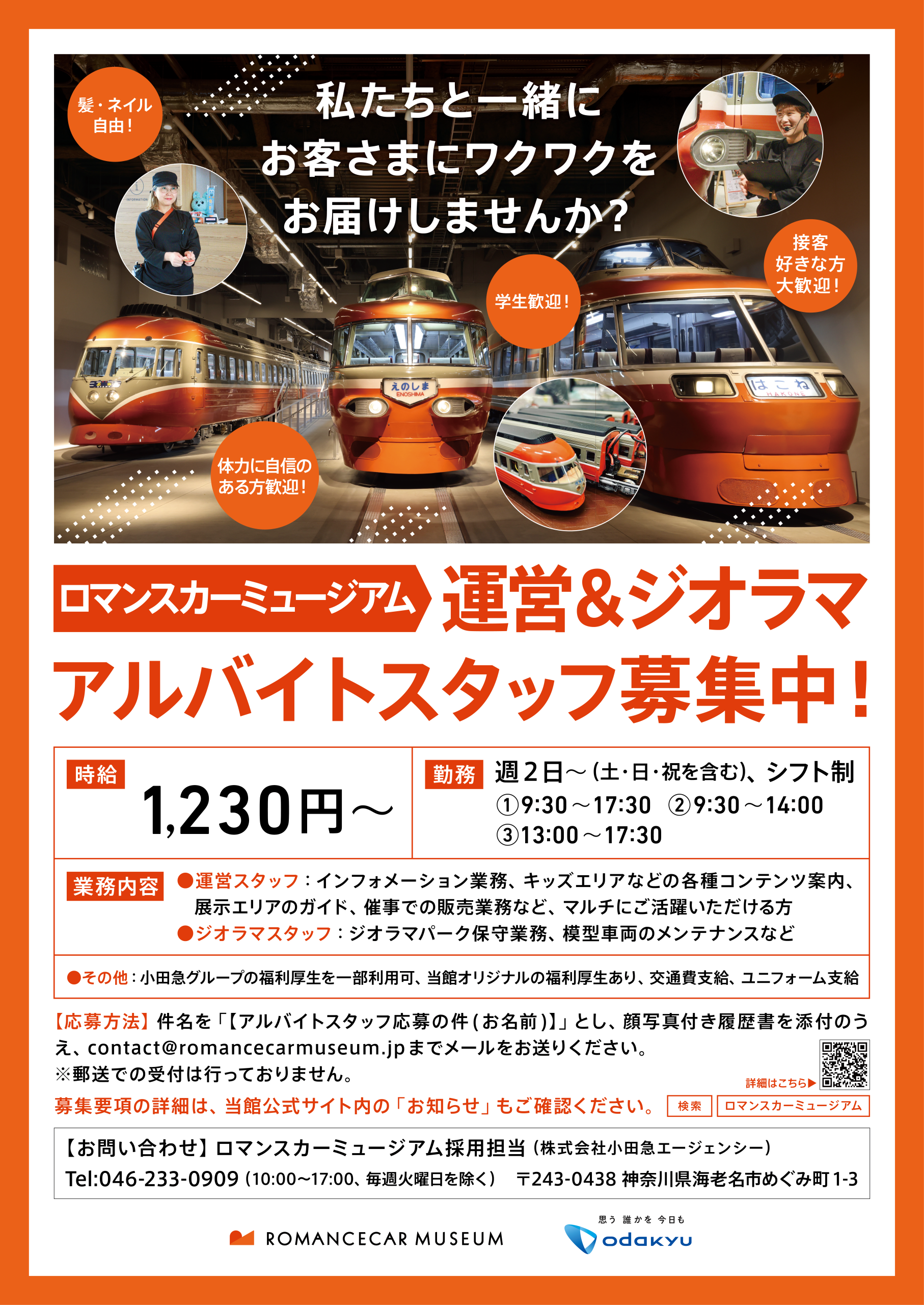 contact@romancecarmuseum.jp(ロマンスカーミュージアム採用担当宛て)に、