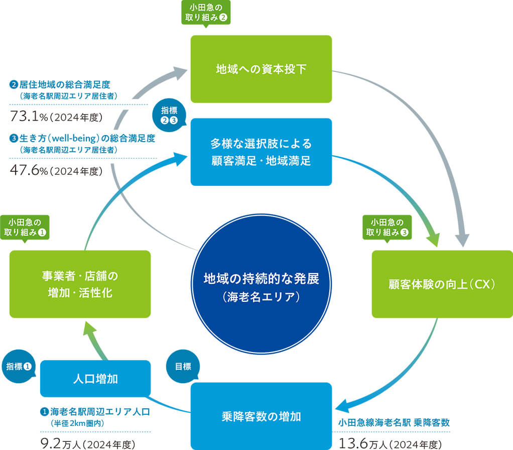 経営戦略との親和性が高く、経営戦略上の重点領域であるこれらの事業を通じた地域への資本投下・活性化と、地域の持続的な発展をあらわすKPIが密接に連動した好循環を生み出すのが、小田急グループならではの地域価値創造の姿です。