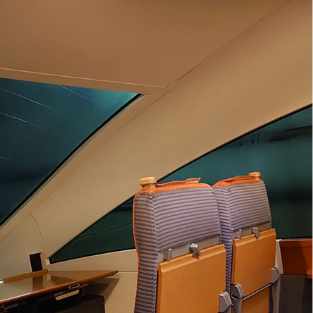 ゆったりとした車内、広く大きい窓、景色を楽しめるようにと窓側に向けられた座席…