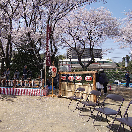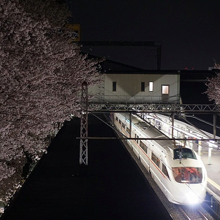 満開の桜が咲く座間駅を走り抜ける白いロマンスカー