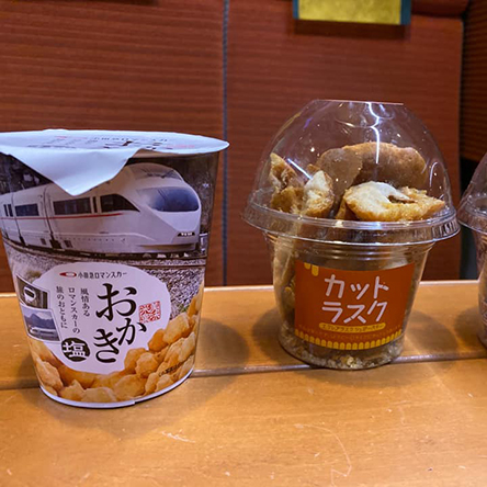 新宿駅のホームのロマンスカーカフェで買ったロマンスカーラスクとおかきを、VSEのサルーン車内で食べたのはとても美味しかったです。